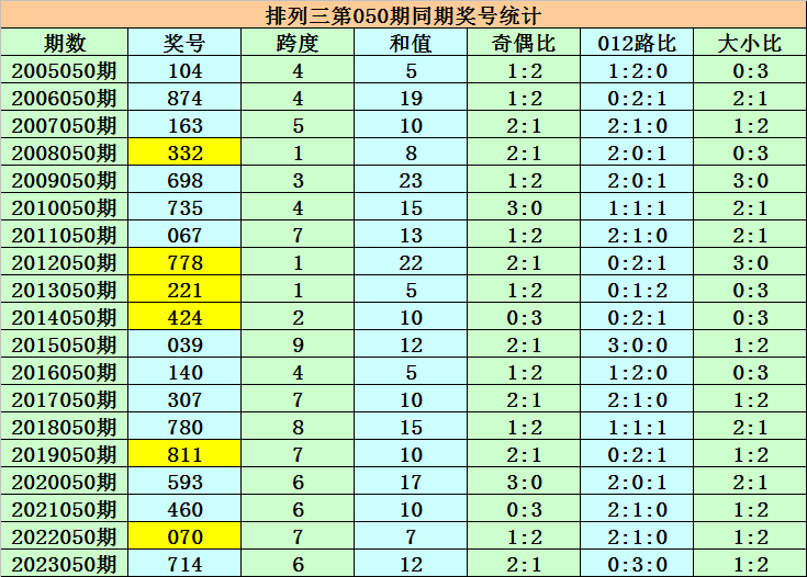 上期回归:枚举三第2023050期奖号为714,组选类型为组六,奖号大小比为1:2,012路比为0:3:0,奇偶比为2:1。