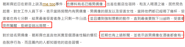聊到这里,印迹太少,网友猜想也思不出会是谁,但葛斯皆接下来曝出的话,就有了一些印迹。葛斯皆说该男偶像是酒后性扰攘惯犯,近期还上过新闻,相同会在酒后出现脱序行径,而且圈内的东说念主都知说念他的这些民俗。