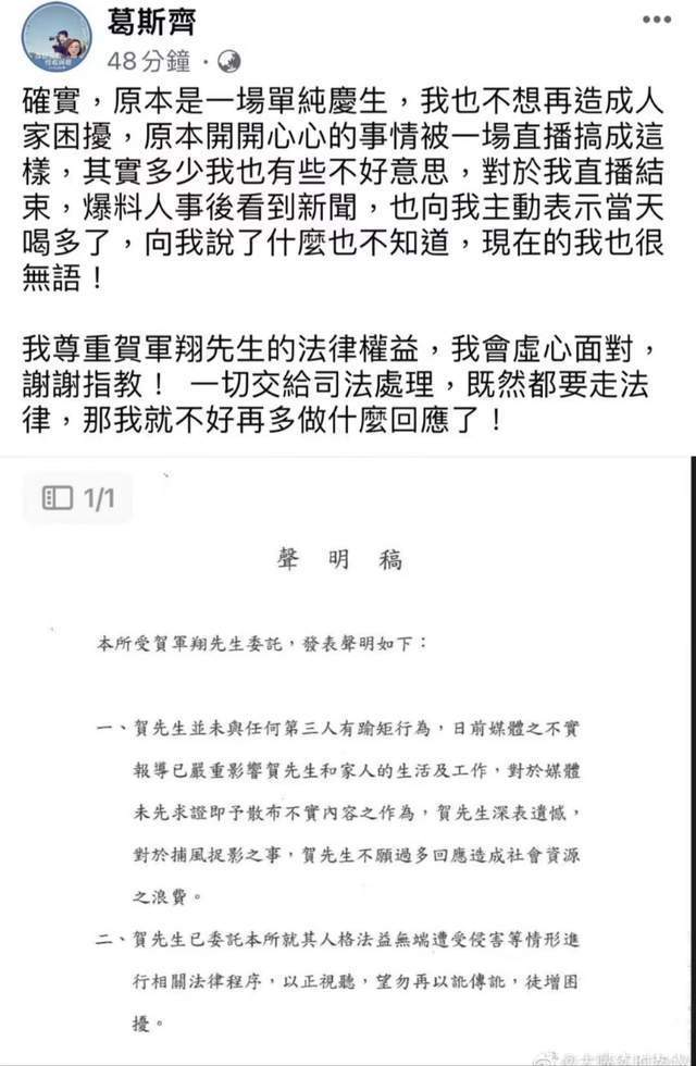 5月中旬,葛斯皆在直播中爆料,径直点名贺军翔。